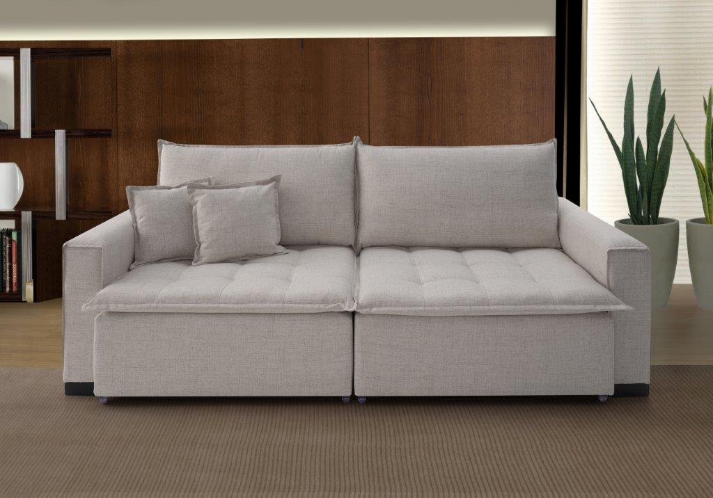 Largura: 230cm Altura: Altura 100cm Profundidade: 118cm/152cm Retrátil e reclinável Braço 15cm Almofadas soltas com fibra 100% poliéster Assentos com percinta elástica Molas em espiral e espuma D30