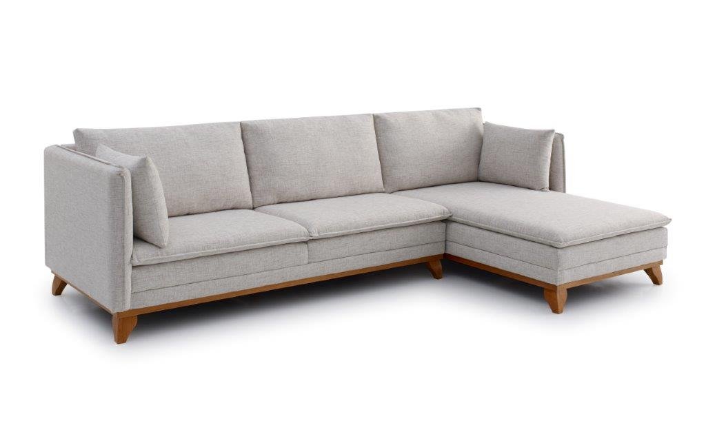Largura: 290cm Altura: 95cm Profundidade: 85cm/60cm Chaise fixa Braço 10cm Almofadas soltas com fibra 100% poliéster Assentos com pillow e percinta elástica Molas em espiral e espuma D30