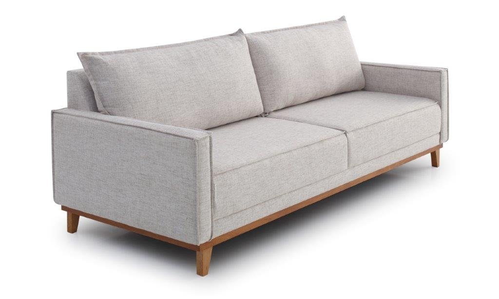 Largura: 225cm Altura: 95cm Profundidade: 85cm Sofá living Braço 10cm Almofadas soltas com fibra 100% poliéster Assentos com percinta elástica Molas em espiral e espuma D30